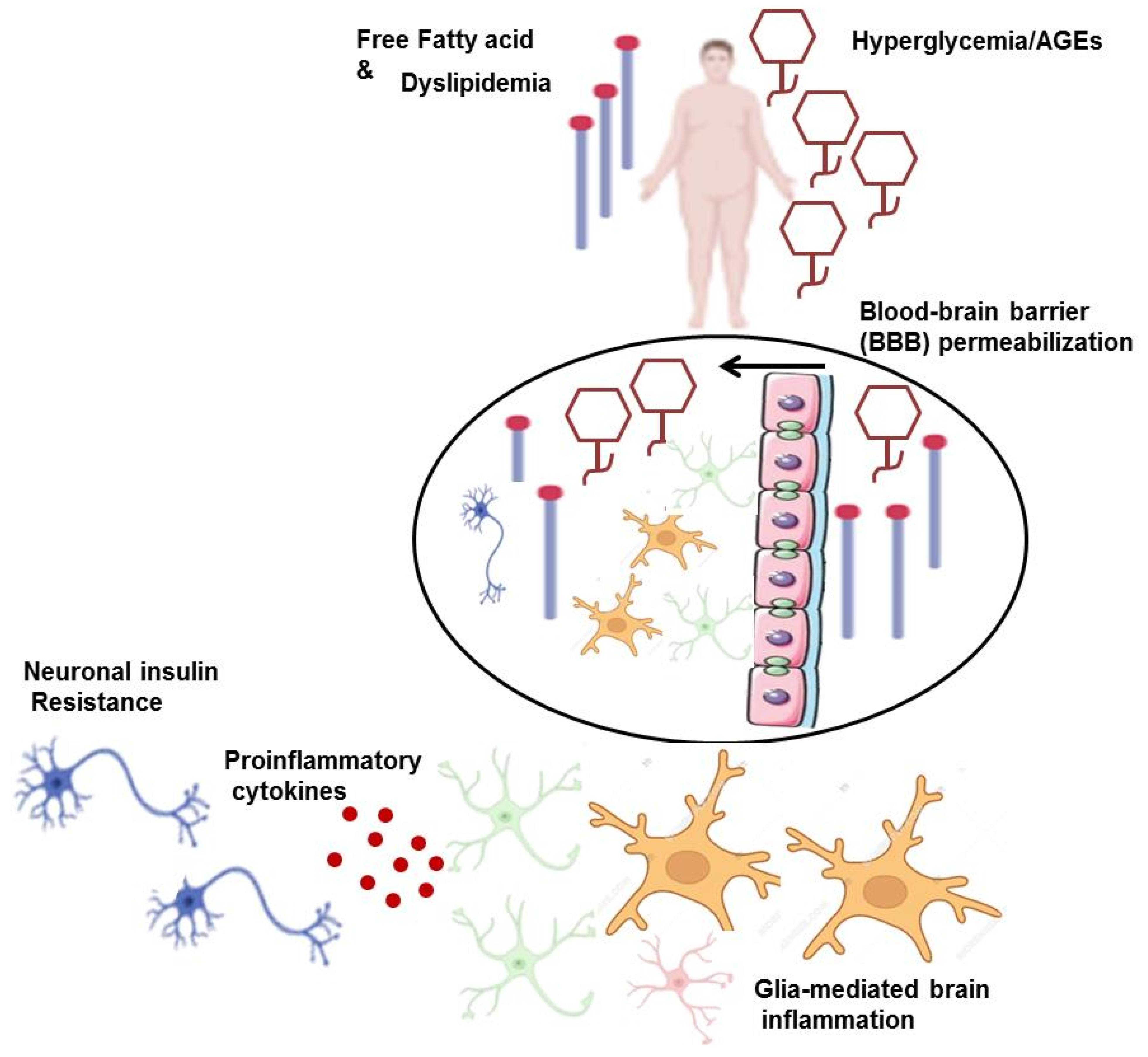 - Rom, S.; Zuluaga-Ramirez, V.; Gajghate, S.; Seliga, A.; Winfield, M.; Heldt, N.A.; Kolpakov, M.A.; Bashkirova, Y.V.; Sabri, A.K.; Persidsky, Y. Hyperglycemia-Driven Neuroinflammation Compromises BBB Leading to Memory Loss in Both Diabetes Mellitus (DM) Type 1 and Type 2 Mouse Models. Mol. Neurobiol. 2019, 56, 1883–1896. [Google Scholar] [CrossRef]
