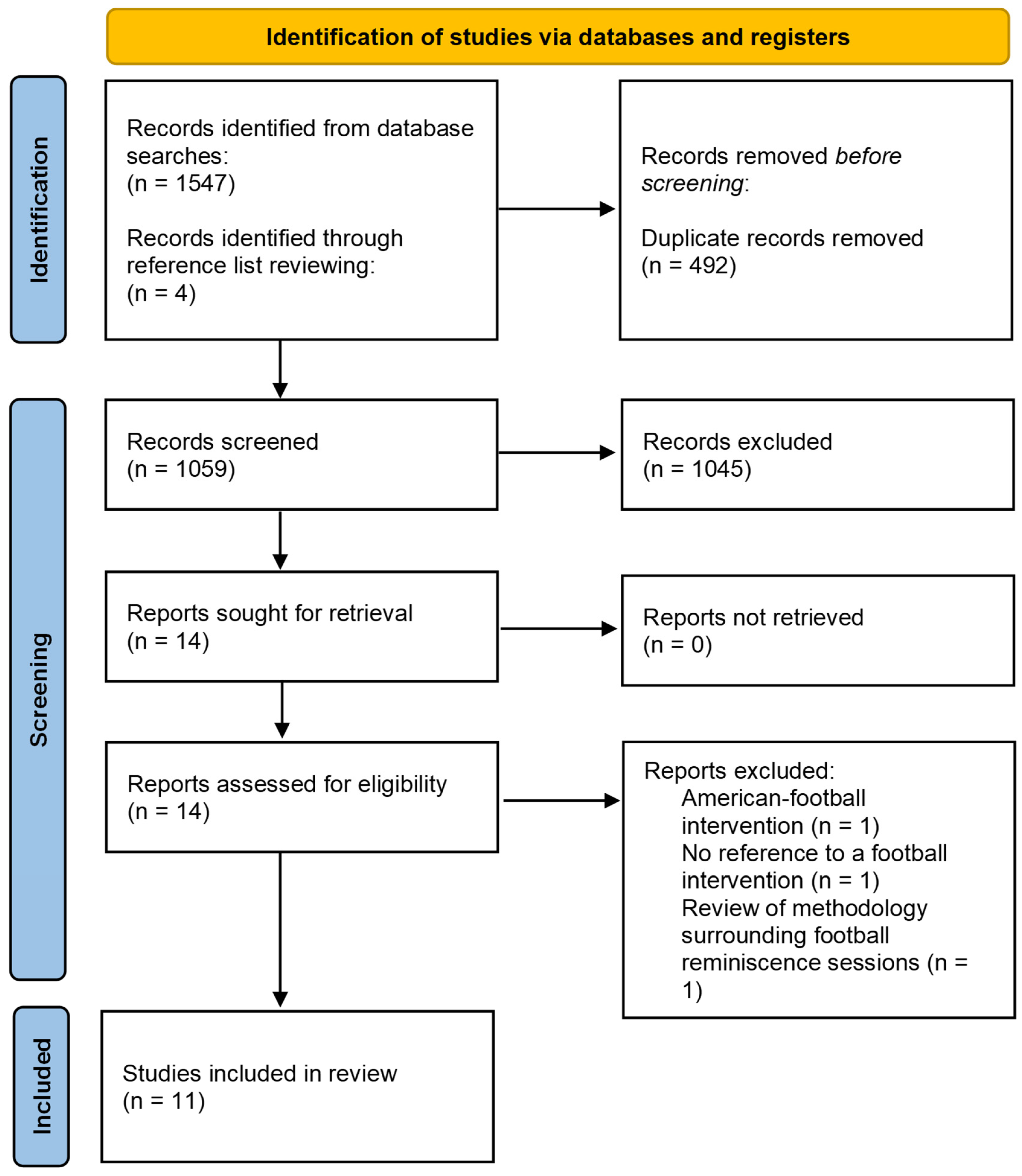 - Coll-Planas, L.; Watchman, K.; Doménech, S.; McGillivray, D.; O’Donnell, H.; Tolson, D. Developing Evidence for Football (Soccer) Reminiscence Interventions Within Long-term Care: A Co-operative Approach Applied in Scotland and Spain. J. Am. Med. Dir. Assoc. 2017, 18, 355–360. [Google Scholar] [CrossRef] [PubMed]