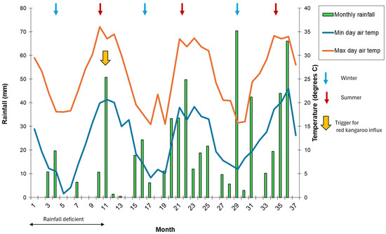 The typical pattern of hot summers and cool winters prevailed during the study (Figure 1). Monthly rainfall was sporadic in the first 15 months, but thereafter relatively regular to the conclusion of data collection (Figure 1). Rainfall deficiencies (0 mm) were frequent in this first period but did not amount to drought under the Australian Bureau of Meteorology’s definition (http://www.bom.gov.au/climate/drought/drought-definitions.htm (accessed on 4 November 2024)).