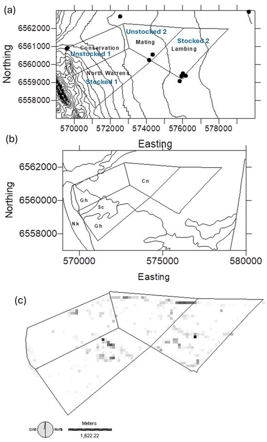 The study centred on four adjacent paddocks on the eastern side of the station (Figure 2a). They are named Conservation (destocked for 30 y), North Warrens, Mating (destocked for 10 y), and Lambing. For clarity, further reference to paddocks is by their stocked condition: Unstocked 1 (Conservation), Stocked 1 (North Warrens), Unstocked 2 (Mating), Stocked 2 (Lambing). Given the differences in stocking history and landscape (see following), the paddocks are treated as two matched pairs.