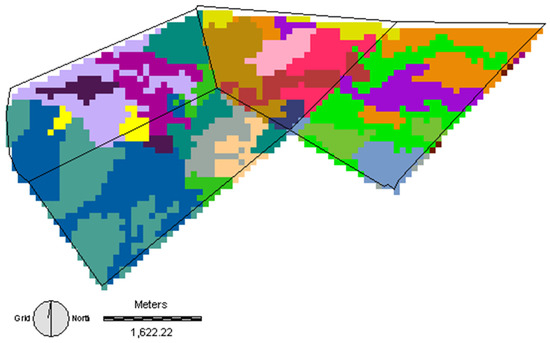 Mosaic of 20 landclasses, shown as different colours, comprising the study site.