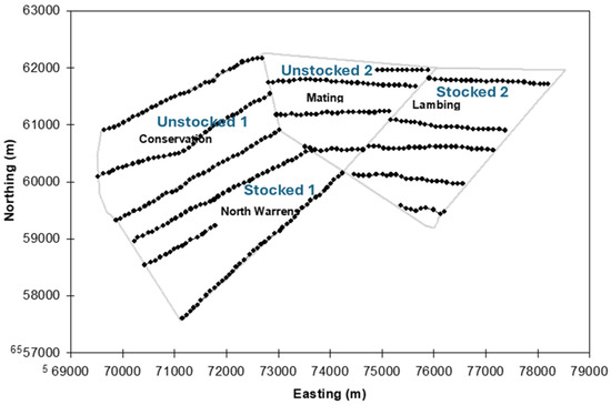 Population surveys were conducted at monthly intervals for the three years of the study. The counts were taken along transects (Figure 3), and the ‘strip-transect’ method was used to estimate the size of the population [112]. The strip width was 250 m to each side of a transect and, as these were about 500 m apart, the whole of each paddock was effectively surveyed. We assumed that we detected and counted all animals and that any bias was constant since the observer (IW) and transects were fixed. Surveys were performed in the morning, starting at sunrise since most kangaroos are active and most easily seen in the first two hours after sunrise, regardless of the season [113]. Counts were conducted on clear still mornings. First light and cloudless skies provided the best visibility, and windless conditions made the kangaroos less flighty.