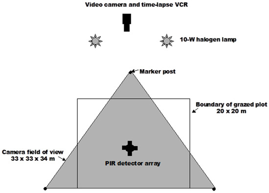 Each grazed plot was concurrently monitored for animal activity across the 3-month period of vegetation and dung pellet surveys. Plots were triangular to encompass the view of a B/W video camera (Panasonic WV-550, Kadoma, Osaka, Japan), with a 6 mm auto-iris wide-angle lens, mounted at one apex and about 3 m above the ground (Figure 6). The data collection preceded the advent of compact camera traps (trail cameras) but the utility of the equipment was effectively the same.