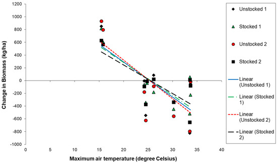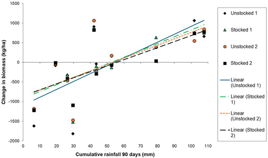 Three variables—rainfall, temperature, and herbivore density—were entered into a regression with vegetation biomass to determine their contributions to the variance explained in the relationship (Table 3). Combined, they explained significant amounts of variation in the change pasture biomass in all paddocks. However, they were weak predictors of change in green grass, green copperburr, or round-leafed chenopod biomass. The cumulative rainfall from the previous three months (90 d) was the best predictor of change in pasture biomass for all plant components, except for forbs. A threshold of around 55 mm of rain led to pasture increase in all paddocks (Figure 7). Lower average temperature was a better predictor of an increase in forb biomass in all paddocks except Unstocked 1. Forb biomass increased below a mean monthly maximum of 25 °C (Figure 8). Unexpectedly, lower monthly maximum temperatures produced a significant increase in grass biomass in Stocked 2 paddock even though grass is typically summer growing (see positive coefficients in Unstocked 2 and Stocked 1). This resulted in a significant negative coefficient for temperature and pasture biomass in Stocked 2 unlike other paddocks.
