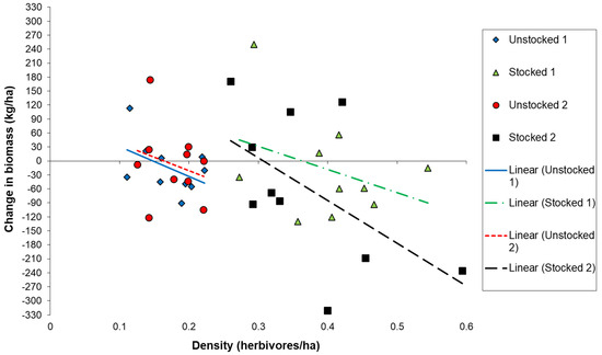 3.1. Relationship of Change in Plant Biomass to Rainfall, Temperature, and Herbivore Density