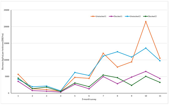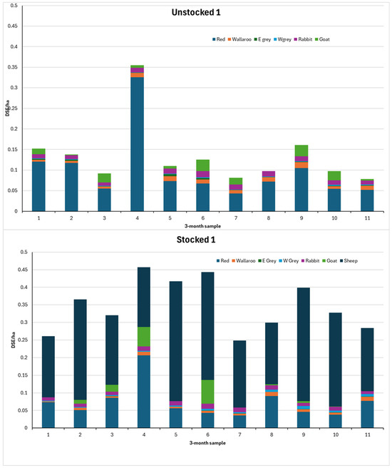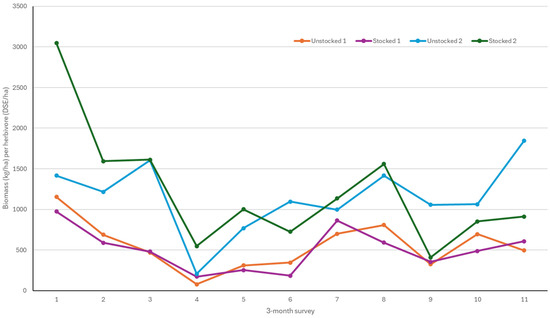 In each month, all four paddocks were surveyed twice. Unstocked 1 and Stocked 1 were surveyed on day 1 and 3. Unstocked 2 and Stocked 2 were surveyed on day 2 and 4. One of the duplicate surveys in each paddock was conducted by riding in one direction and the repeat survey was performed by riding in the opposite direction along all transects to remove bias from time of day and angle to the sun. The average of both surveys for each paddock was calculated to establish the species’ density per hectare.
