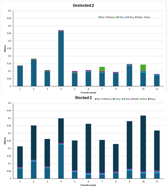 The density of each kangaroo species and goat species was taken as the mean of the population survey in the same month as the vegetation survey and the preceding two months. The value for sheep was the mean of the stocking density for those same three months and included the production of lambs only as additional metabolic mass (Table 2). The value for rabbits was from the 3-monthly survey of active warren entrances that coincided with the vegetation survey. These density estimates were converted into ‘dry-sheep equivalents’ per hectare (DSE ha−1) (Table 2). In Australia, the stocking rate for a pastoral property is estimated as dry sheep equivalents (DSE), i.e., a non-lactating ewe of average size. This provides a common metric to assess the potential grazing pressure of kangaroos, sheep, goats, and rabbits on the study site.