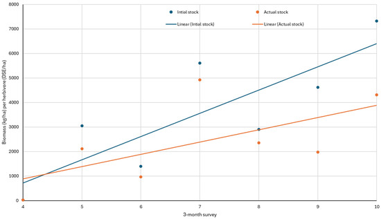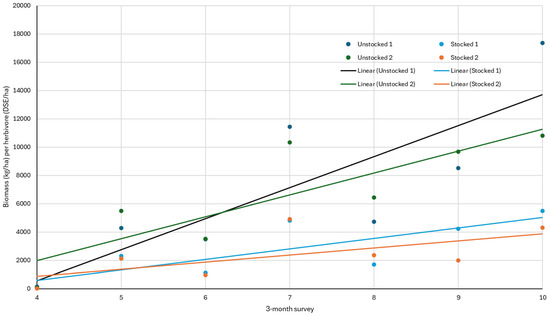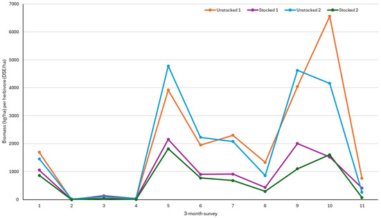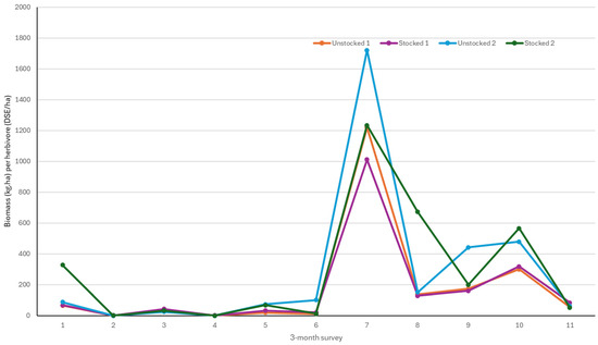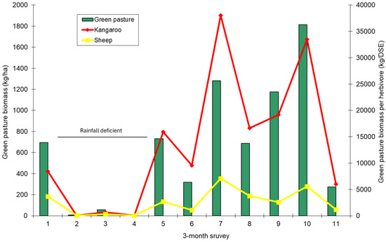 Biomass was estimated and combined into the following units. Total biomass incorporated all recorded plant categories. Pasture biomass included copperburrs, forbs, and grasses. This unit was chosen to make comparisons with studies in Kinchega National Park [111]. Separate biomass estimates were calculated for germinating forbs, germinating grasses, and annual and perennial vegetation. Data were also analysed with respect to the proportion of available green pasture biomass and green copperburr, forb, and grass biomass at any time. Dawson [96] suggested that habitat quality, from the perspective of the herbivores and their diet preferences, is better assessed with respect to the available vegetation that is green. The change in the biomass from the previous vegetation survey to the current survey (expressed as kg ha−1) was calculated and related to the rainfall, temperature, and herbivore density variables (see Section 2.4) by multiple regression.