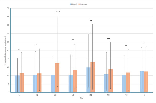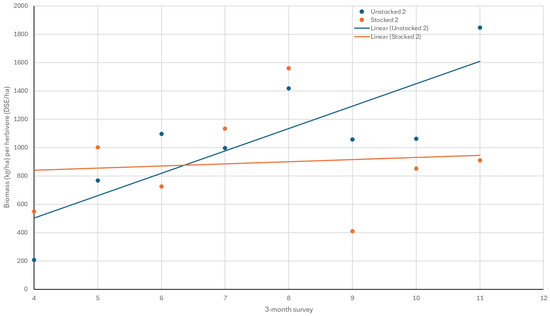 The effect of environmental conditions and grazing on pasture abundance and shrub volume was investigated using exclosure plots and adjacent grazed plots in Unstocked 2 and Stocked 2 (Figure 4). The abundance, height, and greenness of copperburrs, forbs, and grasses as well as total pasture inside and outside of the exclosures were assessed at two-weekly intervals (see Section 2.3.2. Two factors ‘stocked’ and ‘unstocked’ and ‘grazed’ and ‘ungrazed’ were analysed using non-parametric Wilcoxon signed-ranks matched pairs tests.