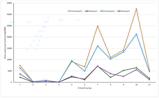 Each 400-m2 exclosure and its nearby like-sized grazed plot was surveyed over three months twice, once in year 2 and in an opposing season in year 3 of this study. In each 3-month survey period, two exclosures and their grazed plots were monitored, one in Stocked 2 and one in Unstocked 2, followed by another set of exclosures and grazed plots until all four sets were surveyed twice. Eight randomly established 1 m2 quadrats in the large 400-m2 exclosures and eight 1 m2 quadrats in their respective grazed plots were monitored. The abundance of pasture species (forbs, grasses, and copperburrs), their height, and greenness were recorded at each sample. The survey periods coincided with a 24 h time-lapse video recording of the grazed plots over three months (see Section 2.5).