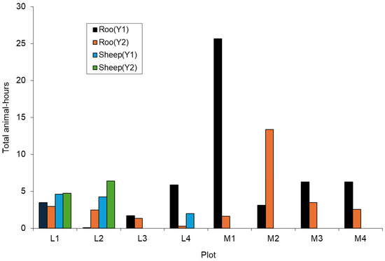 The relative contributions of the various herbivores to the total grazing pressure are generally assigned by apportioning metabolic equivalents amongst the total herbivore biomass rather than examining actual offtake of pasture components. Furthermore, the movements of stock, predominantly sheep in the far west of NSW, are constrained by fences, whereas the other mammalian herbivores can freely distribute themselves. Hence, there is a potential for the spatial separation of the species, and consequently their grazing activities and grazing impacts on the habitat they share, but also aggregation and competition for preferred pasture. Pople and McLeod [23] also argue that despite dietary overlap [39] and food limitation, the habitat use of kangaroos and sheep may be different between the species. Dissociation between kangaroos and sheep has been found in several studies [19,76,77]. A lack of spatial overlap then would limit competition.