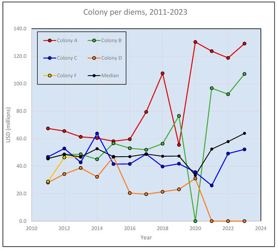 Variation in the per diems among colonies and over time (2011–2023). Legend: Data drawn from publicly available records [40], Chimpanzee Management Reports. CFBR colonies are labeled alphabetically to preserve anonymity. Note that per diems of USD 0.00 do not mean that chimpanzee maintenance costs nothing but that the actual costs were billed to a different contract or grant. See text for Section 4.