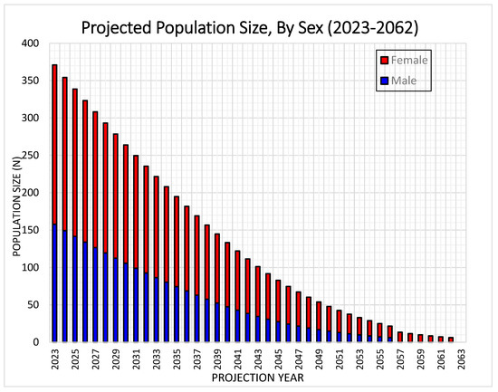The projections indicated that about 50% of the chimpanzees alive in 2023 will have died in the following 13 years, that is, by 2036, leaving N = 181 still alive (Figure 2). By 2044, the population will have declined to about 25% (N = 91) of the initial 2023 population (Figure 2). By 2052, the population will have declined to 10% (N = 37) of the initial population size (Figure 2). In 2057, less than 5% (N = 13) of the 2023 population will still be alive. Males were projected to go extinct in 2056 and females in 2062.