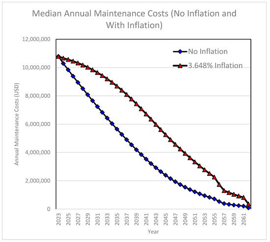 Maintenance costs can be expected to increase due to annual inflation in biomedical research prices [9,41]. To account for expected inflation, we utilized historical data from the Biomedical Research and Development Price Index or BRDPI [42]. Over the past 73 years (1951 through 2023), the median BRDPI inflation rate was 3.648% [42]. This approach conformed to earlier studies by including two sets of cost projections, one set in current dollars with no inflation and a second set that included a typical level of inflation, measured here by the long-term median [9,29,30].