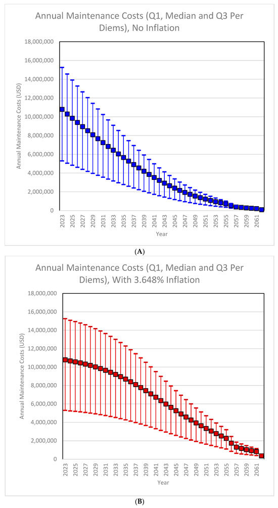 (A) Annual maintenance costs (2024 until 2062) for 3 per diems, no inflation scenario. Legend: Annual maintenance costs, from 2024 to the 2062 extinction, for 3 per diems (Q1, USD 39.11/day; median, USD 79.60/day; Q3 or USD 112.57/day), no-inflation scenario. See text for Section 4. (B) Annual maintenance costs (2024–2062), for 3 per diems, with 3.648% inflation. Legend: Cumulative future maintenance, from 2024 to extinction in 2062, estimated for 3 per diems (Q1, USD 39.11/day; median, USD 79.60/day; Q3 or USD 112.57/day), for the inflationary scenario (3.648% per year inflation). See text for Section 4.