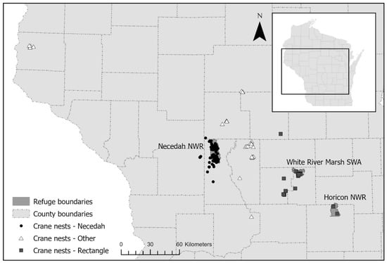 This study includes all known nesting areas of Whooping Cranes in the EMP, all of which have been in Wisconsin, USA (Figure 1). The majority of first nesting attempts (66%) have been at Necedah NWR or the surrounding area, which was the first release site for captive-reared cranes in the population. Necedah NWR is a 17,683 ha area, composed of grassland, oak-pine savanna, emergent and forested wetland, and mixed forest [20]. There also have been nesting attempts in the release area in eastern Wisconsin, known as the Eastern Rectangle (11%), which includes White River Marsh State Wildlife Area (SWA, 7%) and Horicon NWR (1%). White River Marsh SWA is a 4856 ha area, containing emergent wetland, tamarack swamp, and oak savanna [21]. Horicon NWR is an 8660 ha area, dominated by cattail marsh, willow woodlands, and uplands [22]. The remaining nests occurred in areas throughout Wisconsin that have included small marshes on private property surrounded by agriculture, wetlands used as reservoirs for cranberry farms, and additional state or county-protected areas (Figure 1).