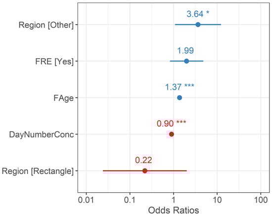 Odds ratios for covariates from the top performing Generalized Linear Mixed Model predicting renesting probability include the region (Necedah NWR, Eastern Rectangle, Other), if a nest was subject to forced renesting management (FRE), the age of the breeding female crane (FAge), and the day the nest concluded (DayNumberConc). We defined nest conclusion as the day the nest either hatched or failed. Significance is indicated by p < 0.05 * and p < 0.001 ***. Variables positively associated with renesting probability are displayed in blue, while those negatively associated with renesting are displayed in red.