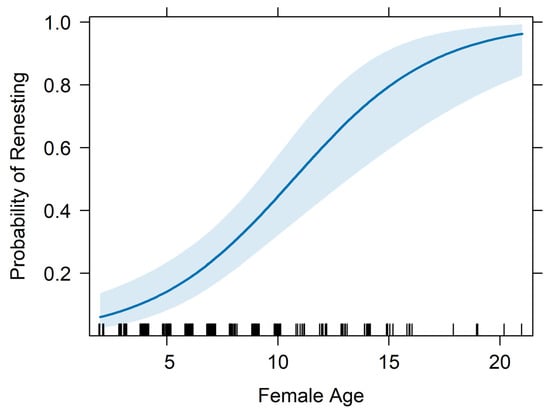 The age and nesting experience of female cranes influenced the renesting propensity of a pair more than that of the male or the pair as a whole, which has been documented in other bird species [14,19,52]. There may be multiple direct and indirect ways age of a female could influence renesting propensity or reproduction more broadly [53]. Older females may be more experienced in foraging or other behaviors that would increase overall fitness or body condition compared to younger females, which could result in more resources to produce a second clutch of eggs [19,54]. Additionally, poor-quality breeders may disappear from the breeding population over time, resulting in a higher proportion of high-quality breeders at older ages, that may be more likely to renest [52].