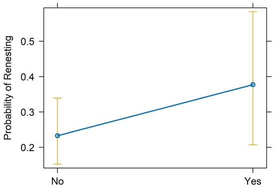 Renesting probability by complete clutch collection to stimulate renesting (No, Yes), also known as “forced renesting”. The point estimate is indicated by dark blue circles connected by a line of the same color, and the 95% confidence intervals are represented by gold bars.