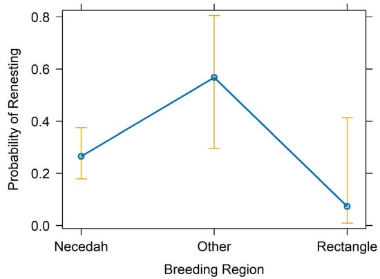 Renesting probability by breeding region (Necedah NWR, Eastern Rectangle, Other). The point estimate is indicated by dark blue circles connected by a line of the same color, and the 95% confidence intervals are represented by gold bars.