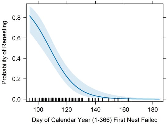 Renesting probability by the day of the calendar year that a pair’s first nest failed. The point estimate is displayed in dark blue, the 95% confidence intervals are in light blue, and black vertical marks on the x-axis indicate observed values of nest failure dates in the database.