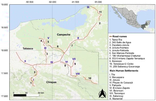 The road network, consisting of federal roads (with greater length and reach, connecting different states and regions, and therefore subject to heavier traffic) and state highways (shorter, limited to a single state, and generally experiencing less traffic), is located between the states of Campeche, Chiapas, and Tabasco, with coordinates ranging from 17.21976816° N to 18.96406386° N and −92.79105556° W to −91.0146248° W (Figure 1). This network traverses a predominantly tropical humid forest ecosystem, which includes wetlands and alluvial plains. The Usumacinta and Grijalva rivers play a key ecological role, supporting an extraordinary level of biodiversity. The climate in this area is warm and humid (Af and Am according to Köppen []), with temperatures ranging from 24 °C to 28 °C and annual precipitation exceeding 2000 mm. The terrain is predominantly flat, with some hills and wetlands. Land use includes agriculture, livestock, urban development, and protected areas.
