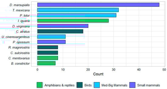 A total of 354 roadkill events were recorded, including 272 in 2016 and 82 in 2023. These involved 198 mammals (94 small and 104 medium-large), 66 birds, and 90 amphibians and reptiles, which belong to 73 species from 43 families. Species richness was highest in birds (28 species) and amphibians & reptiles (26 species), followed by medium-large mammals (12 species) and small mammals (7 species). At the family level, birds had the highest diversity (18 families), followed by amphibians & reptiles (12 families), medium-large mammals (9 families), and small mammals (4 families). The three species most frequently recorded as roadkill were all mammals: Didelphis marsupialis (Linnaeus, 1758) (48, 13.56%), Tamandua mexicana (Saussure, 1860) (32, 9.04%), and Procyon lotor (Linnaeus, 1758) (31, 8.76%), totaling 111 events (31.36% of all records). The most frequently recorded bird was Coragyps atratus (Bechestein, 1793), with 18 (5.08%), while Iguana iguana (Linnaeus, 1758) was the most frequently recorded reptile, with 28 (7.91%) (Figure 2).