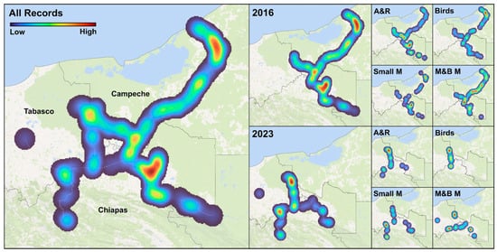Spatial Patterns of Vertebrate-roadkill Collisions in Southeastern Mexico (2016 & 2023).
