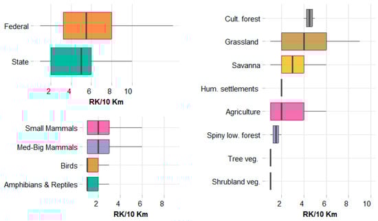 Variation in roadkill rates (RK/10 km) across road types, faunal groups, and landscape cover categories.