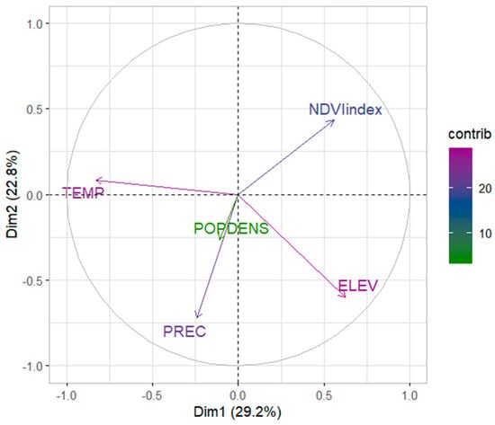 The first four components together account for 88.8% of the total variance, capturing most of the dataset’s structure while minimizing dimensionality loss. The results indicated that the first principal component (PC1) accounts for 29.2% of the variance, the second principal component (PC2) explains 22.8%, and the third principal component (PC3) contributes 20.1%. Together, PC1 and PC2 capture 52.0% of the total variability in the dataset, while the combined contribution of the first three principal components reaches 72.1% of the total variance. Regarding the contribution of variables to the principal components, elevation and temperature exhibit the highest contributions to overall data variability. The normalized difference vegetation index (NDVI) and precipitation show moderate contributions, whereas human population density has the lowest contribution, indicating that its impact on dataset variability is limited compared to environmental variables. PC1 is primarily influenced by temperature (47.20%), whereas PC2 is predominantly associated with precipitation (45.59%). These findings suggest an underlying structure in the data that differentiates collision sites according to specific environmental gradients. (Figure 5).