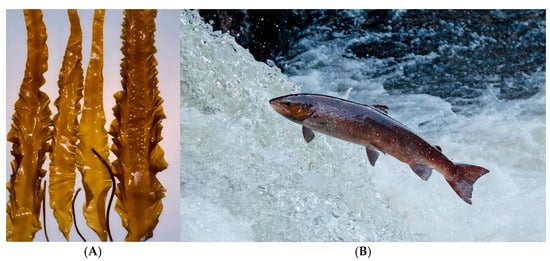 (A) Alaska sugar kelp (Saccharina latissima). (B) Salmon, Alaska.