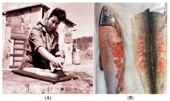 (A) Katrina processing a king salmon, 1964. Yukon River Alaska collection of the Atwood Resource Center, Anchorage Museum, Alaska. Photographer: Steve McCutcheon. (B) Salmon skin processing. Photo: Elisa Palomino.