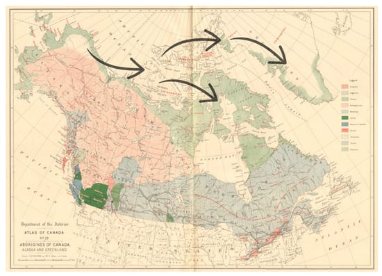 By the fifteenth century, Thule populations had spread across more than 2.8 million km2, from Alaska to Greenland (Figure 4). This expansion required reliable access to food for nourishment and skins for garment production. Greenlandic Inuit, descendants of Thule migrants, maintained semi-nomadic lifeways combining summer salmon fishing with winter seal hunting. These subsistence strategies relied on material knowledge and technical expertise. Ethnographic evidence from the late nineteenth and early twentieth centuries provides insights of these adaptations [35].
