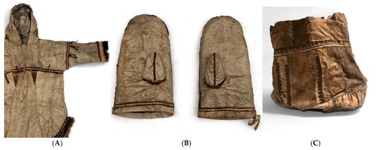 Alaska Native women used salmon skins to create parkas (Figure 5A), boots, mittens (Figure 5B), bags (Figure 5C), blankets, and tents [39].