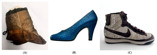 (A) Salmon skin boots, Ainu, Hokkaido, Japan. NMNH, Smithsonian Institution, Washington, DC, USA. Photograph: Elisa Palomino. (B) Salvatore Ferragamo, pump, 1930–1935, turquoise-dyed snapper leather. Courtesy of Museo Ferragamo, Florence. Photograph: Christopher Broadbent. (C) Nike sneakers made of perch leather from Atlantic Leather tannery. Photograph: Elisa Palomino.