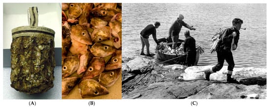 Beyond subsistence, capelin also held spiritual value. After being skinned, the fish heads were dried and used to decorate small carrying bags (Figure 7A), a practice that reflected the integration of natural materials into household items. These decorated bags were used not only for storing food but also as part of broader fishing practices, since including capelin heads (Figure 7B) in the design of these bags would invoke the spirit of the capelin, attracting future catches (Figure 7C) through connecting with the animal’s essence [46]. Unfortunately, their organic composition has meant that few historical examples have survived.