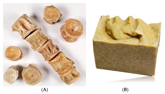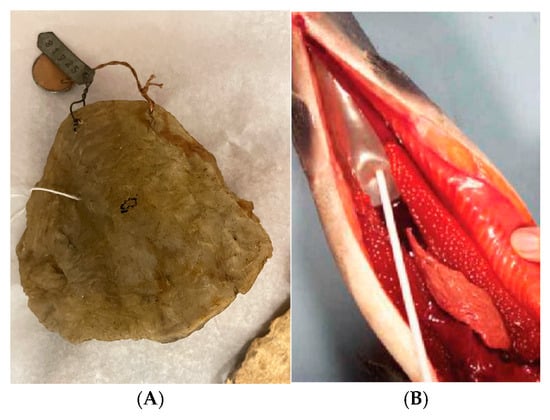 In North America, isinglass (Figure 9A) is made from cod or hake. The production process involves removing the air bladders (Figure 9B) from the fish, cleaning them, air-drying them, boiling them, and transforming them into a highly effective adhesive. Once dried, the bladders are cut into thin, translucent strips. These strips, composed of nearly 80% collagen, are then dissolved in hot water, diluted, and cooled into flat disks [55]. Fish glue is transparent, colourless, and water-soluble, and can bond materials strongly, drying with a shiny finish [4].