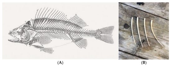 Historically, fish bones (Figure 10A) were used to craft needles (Figure 10B), along with reindeer, bird, and other animal bones. Today, commercial steel needles are used instead. These needles were either carved with a notch for threading or drilled using a mouth bow drill. Fish bones found in early Greenlandic Thule houses may have been used as awls or pins for very light sewing work [56], while larger bone needles and awls were used to sew thicker skins such as walrus or moose [15,19,23].