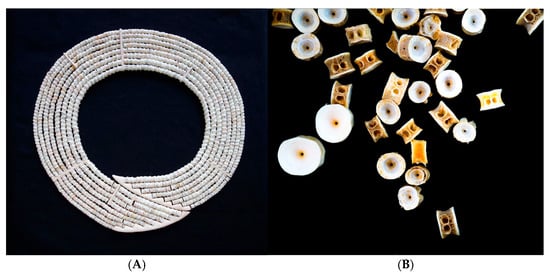 Today, the spiritual and ecological significance of vertebrae persists in contemporary practices. Rika Mouw, an artist from Alaska’s Kenai Peninsula, creates environmental jewellery (Figure 11A) using coiled fish vertebrae (Figure 11B). Her work draws attention to the fragility of marine ecosystems, addressing themes such as ocean acidification, oil drilling, and overfishing. Her pieces, made in Homer, encourage reflection on the connections between humans and the natural world [63].