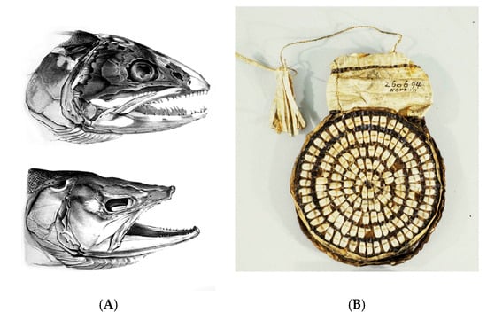 Ceremonial treatment of animal remains is well recorded among Inuit, with intentional ritual disposal of marine mammals reflecting a worldview that respected the spirits of hunted animals. Among the Yupik, bones from trap-caught fish were ritually disposed in ways that prevented dogs from eating them, suggesting ritual concern with how remains were handled [57]. A unique find of four char vertebrae strung on a baleen cord from a Thule house at Cape Kent in northern Greenland may represent its use as an amulet [58], but widespread ritual treatment of fish bones is not evident in archaeological finds. However, Birket-Smith [59] describes a toy made of thirteen fish cranial bones.