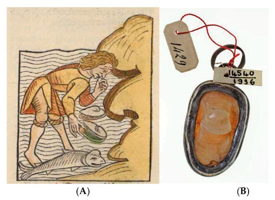 - Piques, G. La cinaedia, pierre précieuse dans la tête d’un poisson. In Thermae Gallicae. Les Thermes De Barzan (Charente-Maritime) Et Les Thermes Des Provinces Gauloises; Bouet, A., Ed.; Ausonius: Bordeaux, France, 2003; pp. 503–506. [Google Scholar]