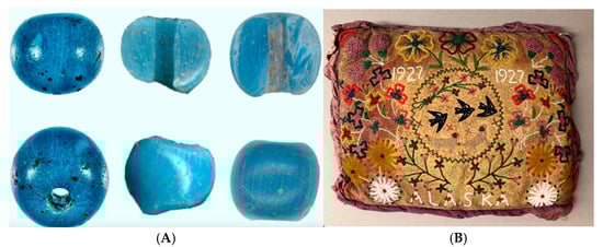 Archaeologists in northern Alaska have uncovered blue glass beads (Figure 15A) that may point to earlier trade connections than previously confirmed. These beads could have been made in Venice, travelled east along the Silk Roads, and eventually crossed Eurasia and the Bering Strait to reach Alaska. Radiocarbon dating of twine made of organic material found with the beads suggests they were made between 1397 and 1488. This find suggests that long-distance trade networks may have reached the region well before European contact, offering new insights into early global exchange [71,75].