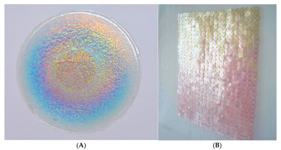 Today, the environmental consequences of synthetic adornment, such as plastic sequins, have prompted renewed interest in sustainable alternatives. Designer Elisa Brunato has developed bio-iridescent sequins from tree-derived cellulose (Figure 16A), offering an eco-conscious material for fashion (Figure 16B). These bioplastic embellishments recall earlier practices such as the use of otoliths and fish vertebrae by Alaska Native communities to decorate garments and accessories [76].