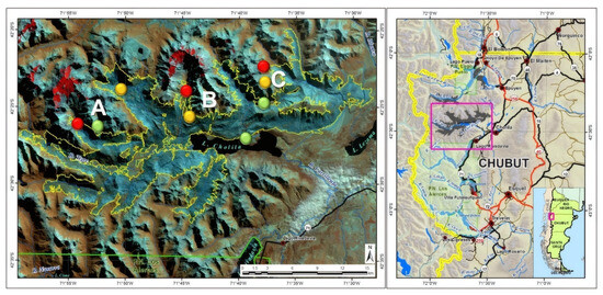 Study area. Sampling sites: Villegas and Tigre valley (A), Cholila lake center (B), and Cholila lake east (C) (map from [5]). In the zoomed-in map, the yellow line indicates the wildfire perimeter, green dots unburned sites, yellow dots moderately affected sites, and red dots severely affected sites.