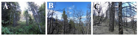 This study was carried out in three pure stands of A. chilensis forest affected by 2015 wildfire, called “Las Horquetas” fire, in Villegas and Tigre Valley (A), Cholila lake center (B), and Cholila lake east (C) in Chubut province (Figure 1).