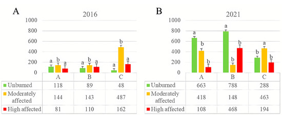 Wildfire severity classification according to [56]: (A) unburned; (B) moderately affected; and (C) severely affected.