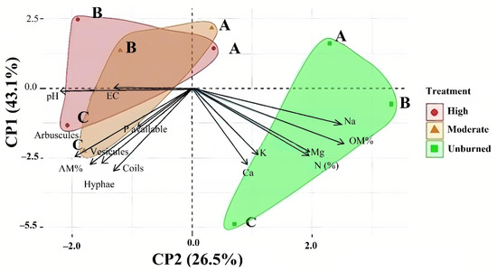 Principal component analysis (PCA) showed that the combination of AM structures, AM%, and soil features (Figure 5) could be explained by two components, including 69.6% of the variance (Tables S5 and S6); PC1 and PC2 explained 43.1% and 26.5% of the variance, respectively. PC1 discriminates between burned treatments and unburned, while PC2 discriminates between sites (A = Tigre and Villegas valley, B = Cholila lake center, and C = Cholila lake east).