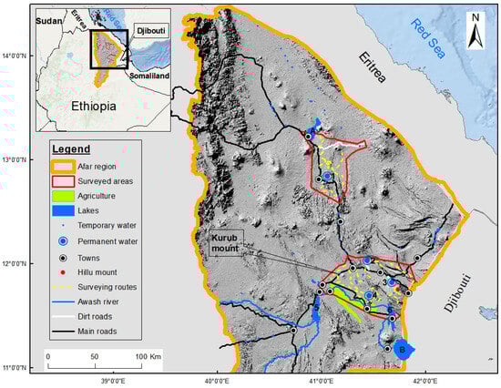This study was conducted in the Danakil Desert of northeastern Ethiopia, which is the hottest place on the African continent, and one of the hottest places in the world [41,42]. The area is characterized by an arid landscape with lava ridges [43,44]. The study area is located between 11°45′20″–13°05′40″ N latitude and 40°55′00″–41°55′15″ E longitude with an elevation ranging from c. 150 m below sea level in Bidu–Afdera up to c. 1500 m above sea level on the MinkileBera in Serdo–Hillu [45]. The potential range of the African wild ass is estimated to be 95,000 km2, while the study area was 12,300 km2. These two surveyed areas (Bidu–Afdera and Serdo–Hillu) constitute approximately 57 percent of the study area (12,300 km2) (Figure 1). There were six permanent water sources identified in the surveyed areas that are potentially used by the African wild ass (see Figure 1). Andeley is one of the permanent water sources located in Bidu–Afdera, which is critical for the survival of the species population occupying this area. This survey site is located in the northern part with an elevation ranging between 150 m below sea level and 50 m above sea level and covers approximately 2560 km2. The climate of this area is extremely hot and dry, with a monthly mean maximum temperature of 43.6 °C during June. The monthly mean minimum temperature was 26.9 °C in January. The monthly mean rainfall of this site ranged between 0.1 mm in February and 34.9 mm in August. The other five permanent water sources are located in Serdo–Hillu. This survey site is located in the southern part with an elevation ranging from 393 to 1045 m above sea level and covers an area of 4473 km2. The monthly mean maximum temperature was 42.5 °C in June, whereas the monthly mean minimum temperature was 17.5 °C in December. The monthly mean rainfall of this area ranged between a low of 0.6 mm in December and January to a high of 40.8 mm from mid-June to August [46].