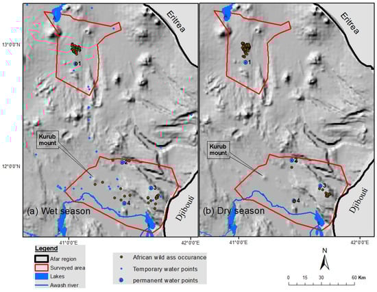 Collecting data on the African wild ass was demanding due to the harsh arid climate and rugged terrain of the study area [47]. The African wild ass in the Danakil Desert appears in very low density in scattered, small, and isolated groups, which makes it impractical to use conventional methods of data collection like line transects [9,10,48]. Some of the areas could be surveyed using a 4-wheel drive vehicle. However, most of the area was not accessible to vehicles. As a result, most of the fieldwork was conducted on foot using survey routes that made it possible to scan hilltops, water points, valleys, and gorges (Figure 1) [49,50]. These foot survey routes cover 963 km (279 km in Bidu–Afdera, and 684 km in Serdo–Hillu) during the survey periods of 126 days, quarterly for two consecutive years. The presence of African wild ass was documented based on direct observations (within a radius of 1000 m and sometimes can be approached up to 400 m after slow habituation), footprints, and fecal droppings (distinguished by their bigger size and patterns) [51], and these points were recorded with a global positioning system (GPS) [38]. Data were collected every three months for at least seven days at each site from December 2017 through February 2020. Surveys were usually carried out when the African wild asses were most active, i.e., in the morning from 06:00 to 11:00 h and in the late afternoon from 15:00 to 18:00 h. Surveys documented data on the presence of African wild ass (seen, camera trapped, foot print or droppings), and settlements (permanent or temporary), livestock, and all permanent and temporary water sources. Then, all coordinates for presence data were combined for the data analysis using Maxent. In total, we collected 411 GPS locations of African wild ass, of which 242 were for the dry seasons and 169 were for the wet seasons. We limited occurrence records to a single point for each 90 m2 pixel so that each pixel would represent an occurrence point to avoid weighting. This reduced the number of recorded occurrence points from (242 and 169) to (116 and 87) for dry and wet seasons, respectively (Figure 2).