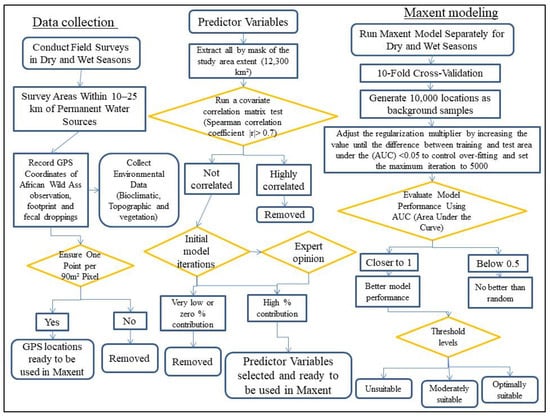 The main objective of this research was to predict the seasonal suitable habitat range of the critically endangered African wild ass, reassessing and refining upon the foundational work of Kebede et al. [14]. Moreover, this study investigated a more illustrative suitable habitat determination considering a larger dataset including factors of temporary water sources and the impact of livestock displacement. In addition, this evidence will be used to strengthen the community-based conservation strategy from the socio-ecological perspective. The Maxent model is employed to understand the potential range and guide future monitoring efforts to survey undocumented areas of the species’ occurrence. Additionally, the information will be used to determine what areas should be designated and protected for the long-term conservation of the African wild ass and other wildlife species in the Danakil Desert of the Afar Region, Ethiopia.